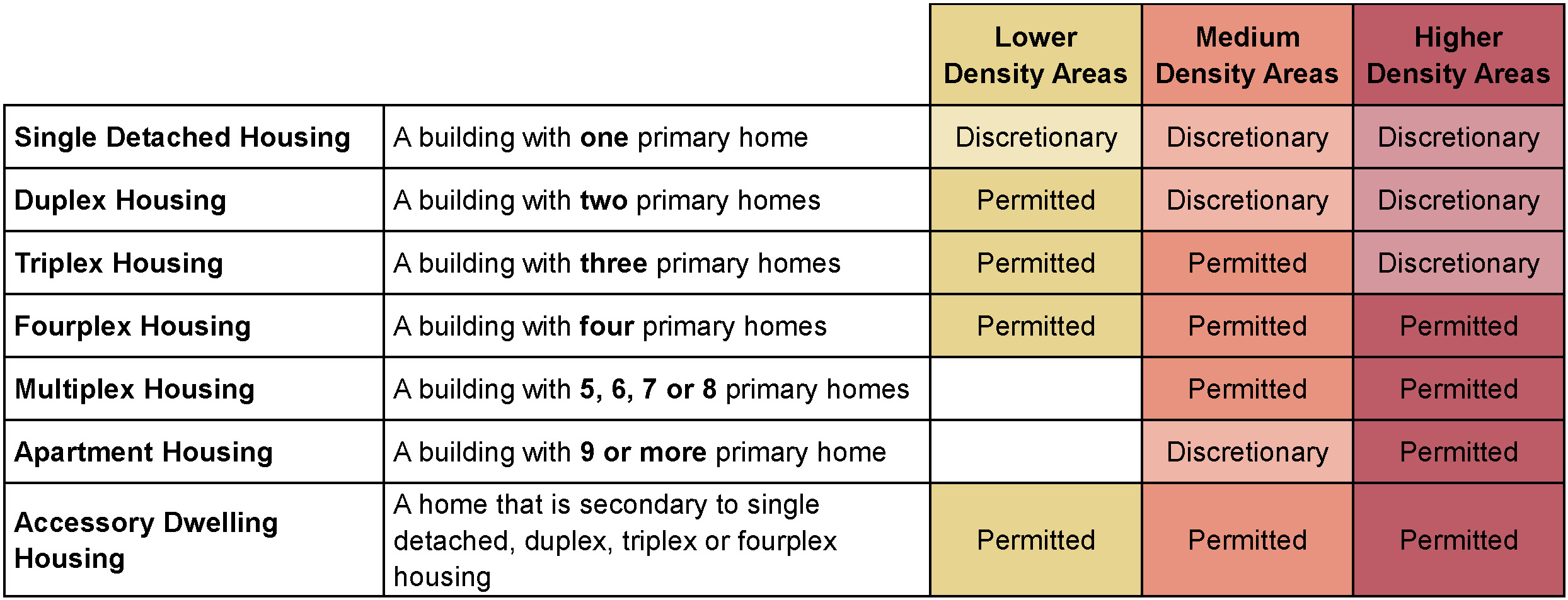 3) Simplified Housing Types Allowed in More Areas – The proposed changes would simplify the definitions of different residential housing types and define which housing types are allowed in the lower-, medium-, or higher-density areas.