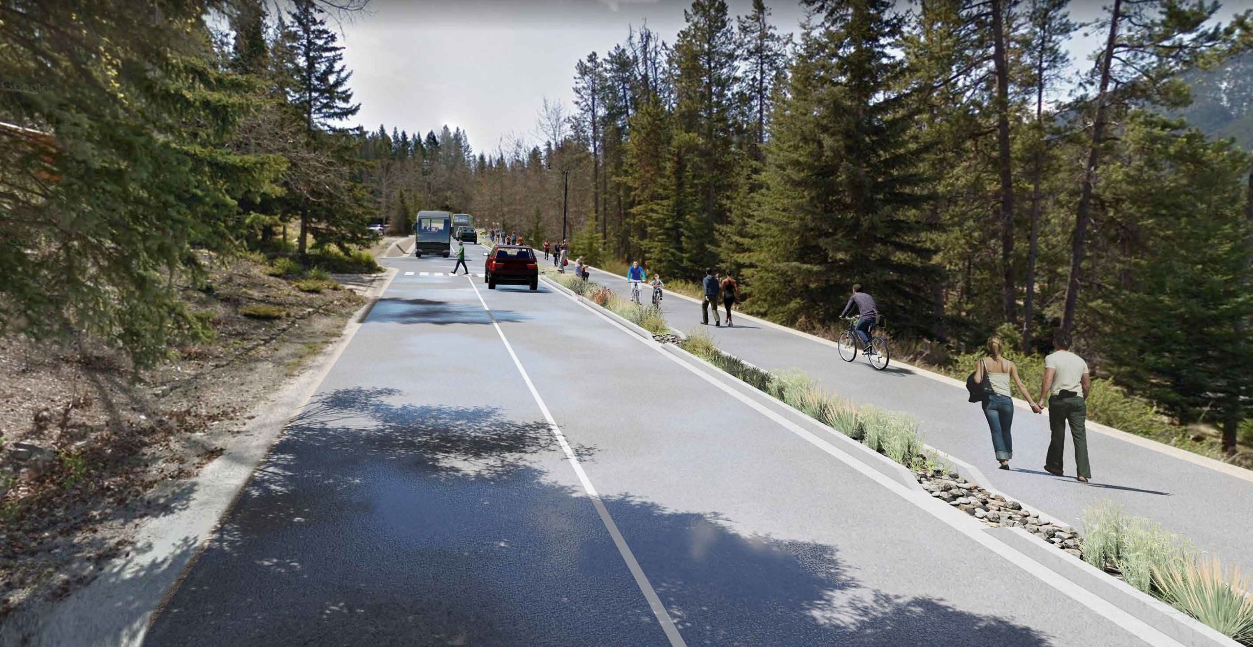 The project team has developed some preliminary concept options to be used as a starting point for decisions, and refinements will be made through stakeholder engagement and the on-going technical review. These options are based on the Banff Streetscape Design Guidelines for this type of road. They have also been designed with consideration given to the unique characteristics of St. Julien Road, such as its width constraints and slope challenges.