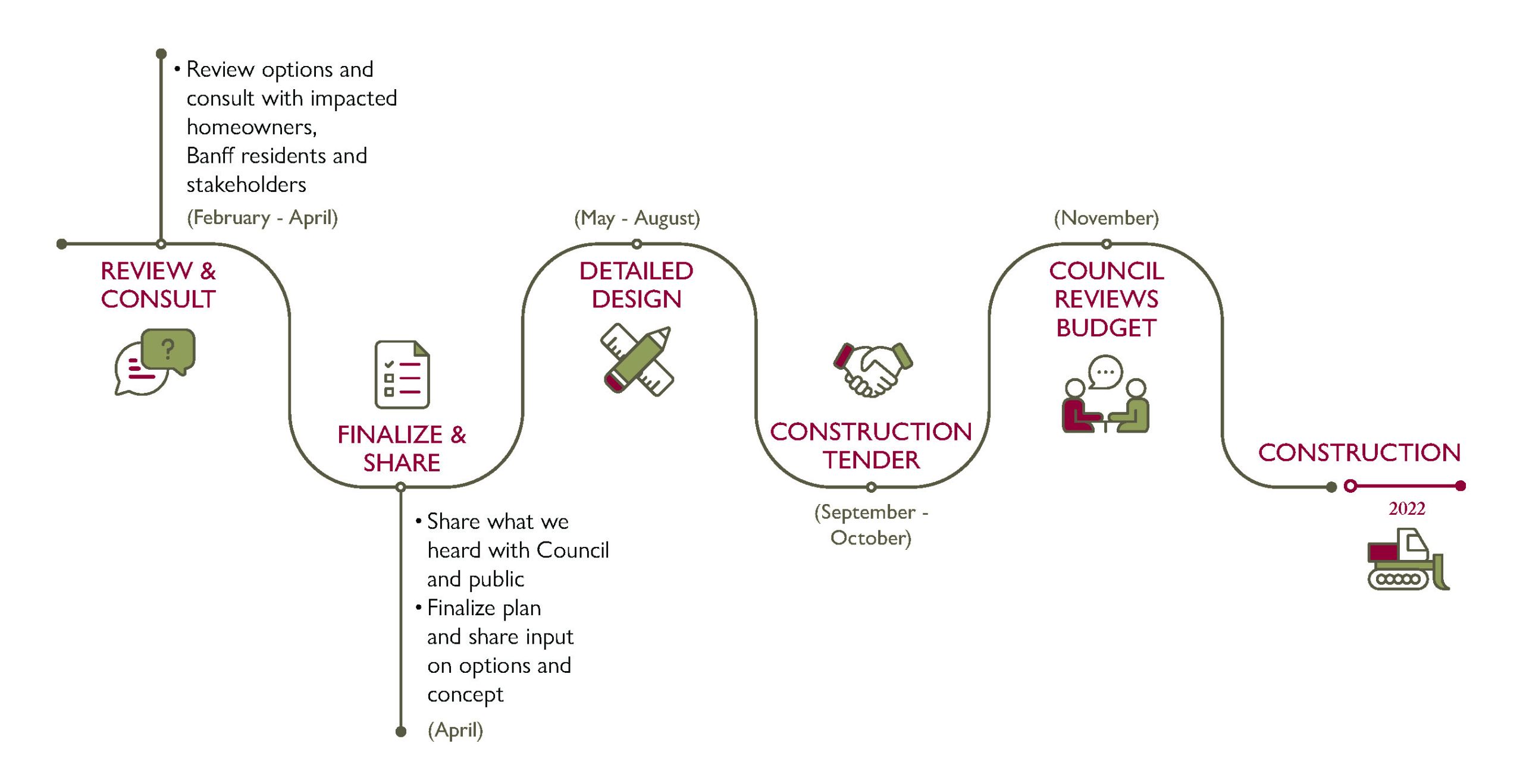 The work will include adding a sidewalk, replacing aging underground water and sewer utilities and light poles, adding landscaping elements, and improving the road surface, drainage and snow storage. The project will completely excavate the road and sidewalk from April to October in 2022, and final surface completion will occur in spring 2023. The Tunnel Mountain trailhead parking lot is not on Town land, and is not part of this project, but access to the lot from the road and sidewalks are part of this project.