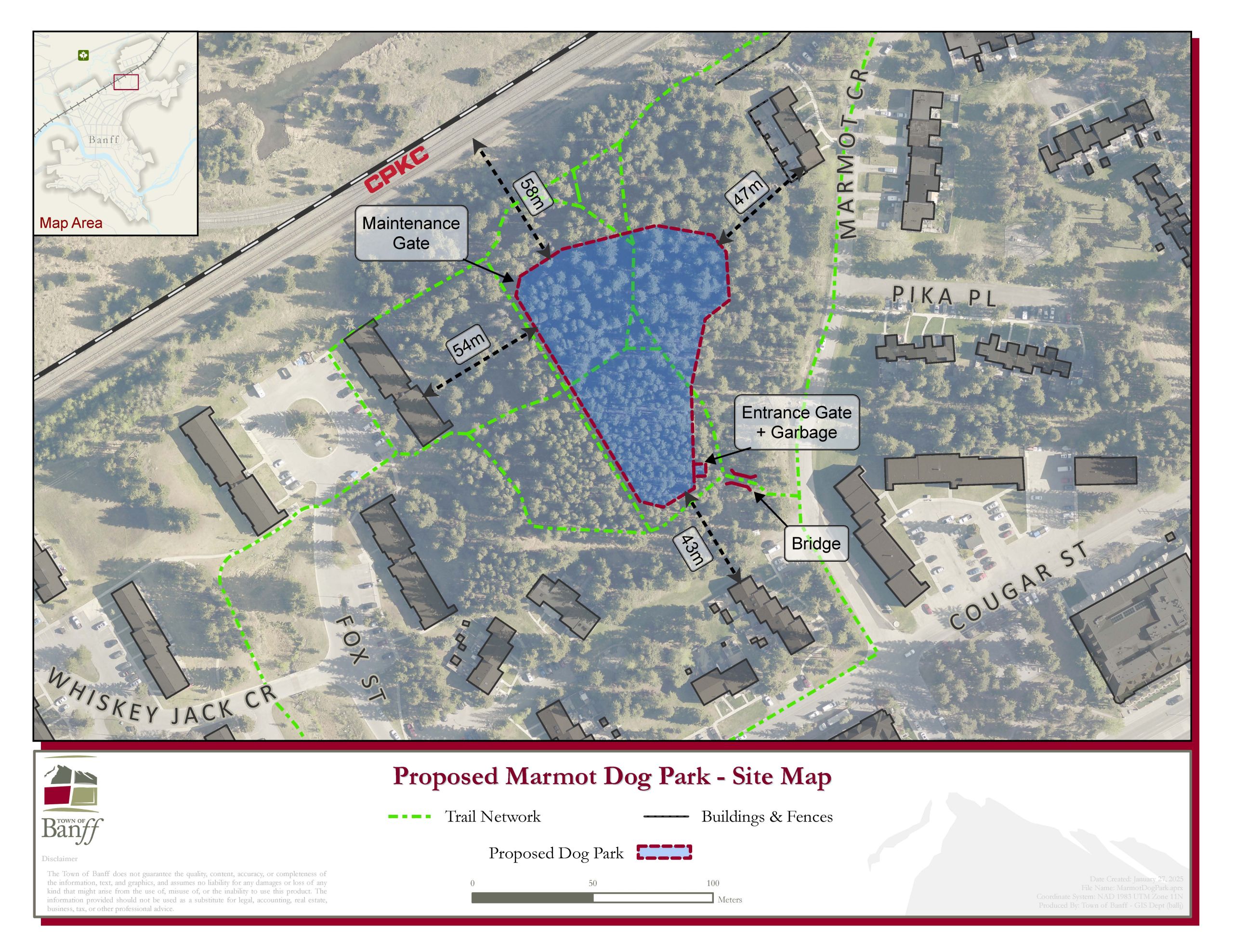 The Marmot Crescent neighbourhood dog park was to be located on the forested land parcel west of Marmot Crescent, east of the Whiskey Jack residential development on Fox Street, and between Cougar Street and the railway tracks and CPKC right of way.